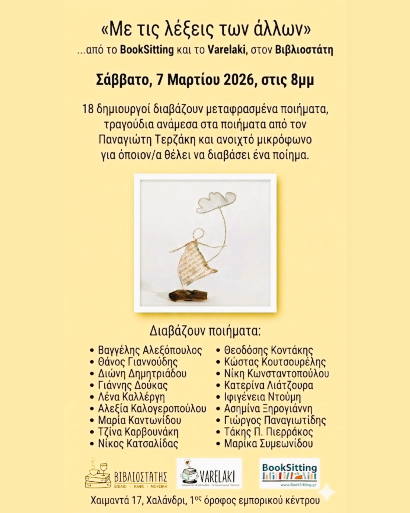 Πώς ακούγεται η φωνή ενός ποιητή όταν «δανείζεται» τη γλώσσα ενός άλλου; Το Σάββατο 7 Μαρτίου 2026, στις 20:00, το BookSitting και το Varelaki συναντιούνται στον Βιβλιοστάτη για μια βραδιά αφιερωμένη στη μεταφρασμένη ποίηση και τη μουσική, που απαντά στην πράξη στην παραπάνω ερώτηση.